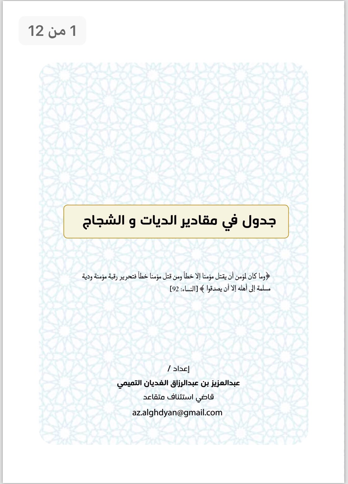 يمثل كتاب جدول في مقادير الديات والشجاج أهمية خاصة لدى دارسي العلوم الإسلامية بشكل عام وأصول الفقه على نحو خاص حيث يتصل كتاب جدول في مقادير الديات والشجاج بالعديد من فروع العلوم الإسلامية بما في ذلك السيرة النبوية. جدول في مقادير الديات والشجاج الشيخ عبدالعزيز بن عبدالرزاق الغديان القاضي بالمحكمة العامة بمحافظة الخبر الحمد لله رب العالمين والصلاة والسلام على نبينا محمد وآله وصحبه أجمعين أما بعد.